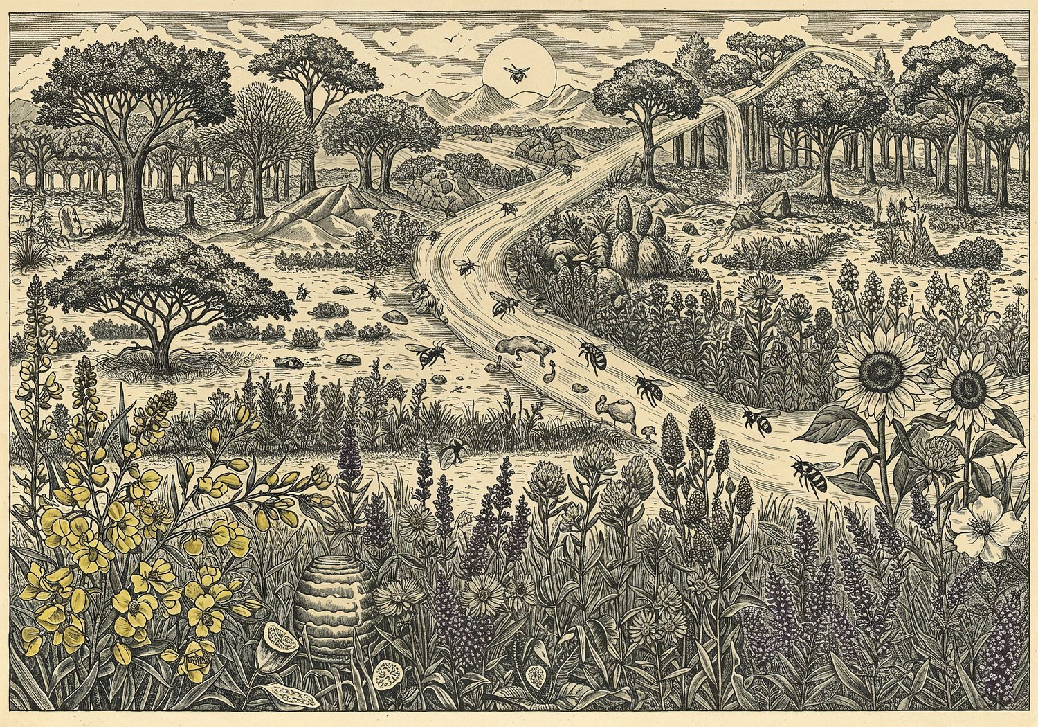Traditional detailed engraving illustration with modern elements, etched lines, high contrast black and white, meticulous cross-hatching to create depth, printed on aged parchment paper of: A vibrant global landscape illustrating the diversity of honey-bearing plants across continents: in the foreground, African acacias with yellow flowers and bees collecting nectar on savanna plains; to the right, European meadows with blooming willows, clover, lavender, and heather surrounded by buzzing bees; in the center, North American prairies filled with sunflowers and asters; behind, Amazon rainforest with cacao and mahogany trees; Asian steppes with tamarisks and rhododendrons on mountainous slopes; Australian eucalyptus forests with flowing blossoms; and in the distant arctic tundra, dwarf willows under a polar sky, all connected by flying bees and streams of golden honey flowing towards a central world map outline, symbolizing ecological balance and threats like subtle deforestation shadows. Illustration: copperplate etching texture, ink lines, dramatic shading, artistic style, deep focus, museum quality print with humorous twist.