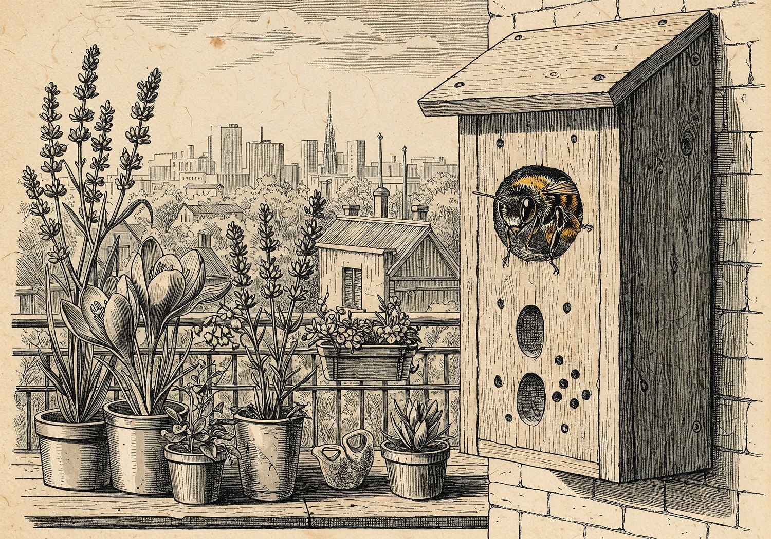 Traditional detailed engraving illustration with modern elements, etched lines, high contrast black and white, meticulous cross-hatching to create depth, printed on aged parchment paper of: A female mason bee emerging from a mud-sealed tube in a wooden insect hotel mounted on a sunny urban garden wall, surrounded by blooming spring flowers like crocuses, lavender, and fruit trees with visible pollen on the bee’s body, a small balcony with potted plants in the foreground, and a blurred city skyline with buildings in the background. Illustration: copperplate etching texture, ink lines, dramatic shading, artistic style, deep focus, museum quality print with humorous twist.