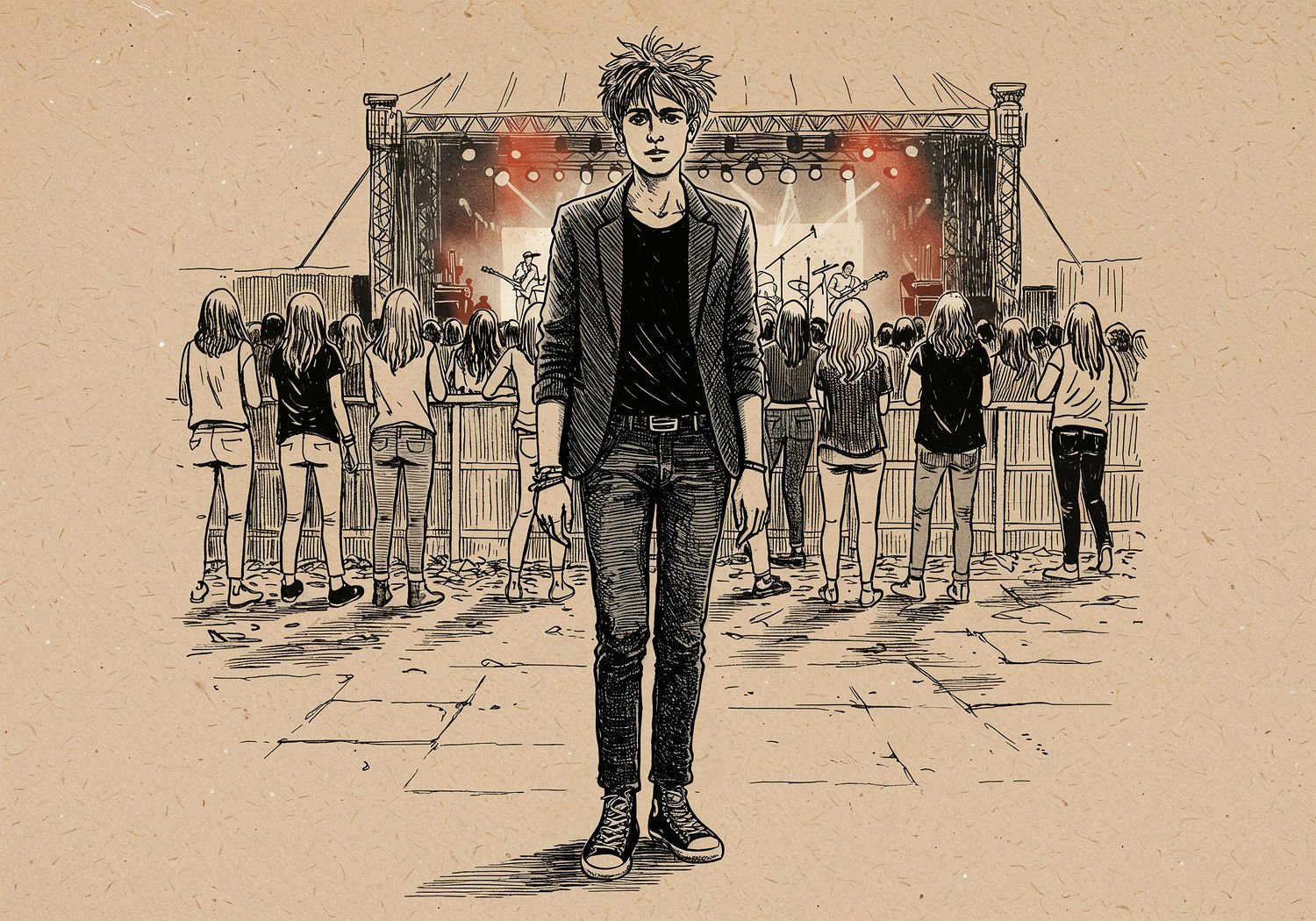 Traditional detailed engraving illustration with modern elements, etched lines, high contrast black and white, meticulous cross-hatching to create depth, printed on aged parchment paper of: Traditional detailed engraving illustration with modern elements, etched lines, high contrast black and white, meticulous cross-hatching to create depth, printed on aged parchment paper of: A young adult with messy hair wearing an open black slim-fit blazer over a plain black t-shirt and dark slim jeans, standing casually in a lively crowd of rock concert fans gathered before a stage under warm summer evening lights, with subtle band bracelets on wrists and black Converse sneakers, arms relaxed and a nonchalant expression, distant musicians visible on stage with guitars and drums. Illustration: copperplate etching texture, ink lines, dramatic shading, artistic style, deep focus, museum quality print with humorous twist. Illustration: copperplate etching texture, ink lines, dramatic shading, artistic style, deep focus, museum quality print with humorous twist.