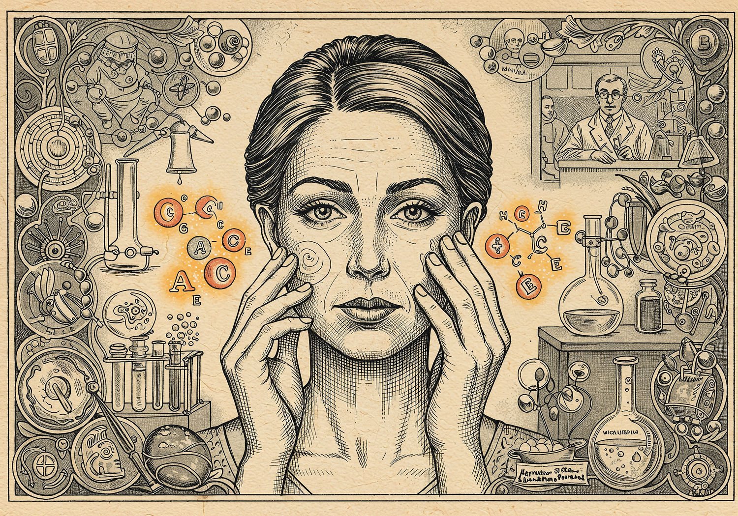 Traditional detailed engraving illustration with modern elements, etched lines, high contrast black and white, meticulous cross-hatching to create depth, printed on aged parchment paper of: Traditional detailed engraving illustration with modern elements, etched lines, high contrast black and white, meticulous cross-hatching to create depth, printed on aged parchment paper of: A middle-aged woman in her 40s applying a cream to her face, with glowing vitamin A, C, and E molecules penetrating her skin to smooth wrinkles and brighten complexion, surrounded by laboratory elements like test tubes, scientific notes on retinol and free radicals, and historical figures of scientists E.C. Dodds and Otto Rosenheim observing in the background, illustrating skin regeneration and anti-aging breakthrough. Illustration: copperplate etching texture, ink lines, dramatic shading, artistic style, deep focus, museum quality print with humorous twist. Illustration: copperplate etching texture, ink lines, dramatic shading, artistic style, deep focus, museum quality print with humorous twist.