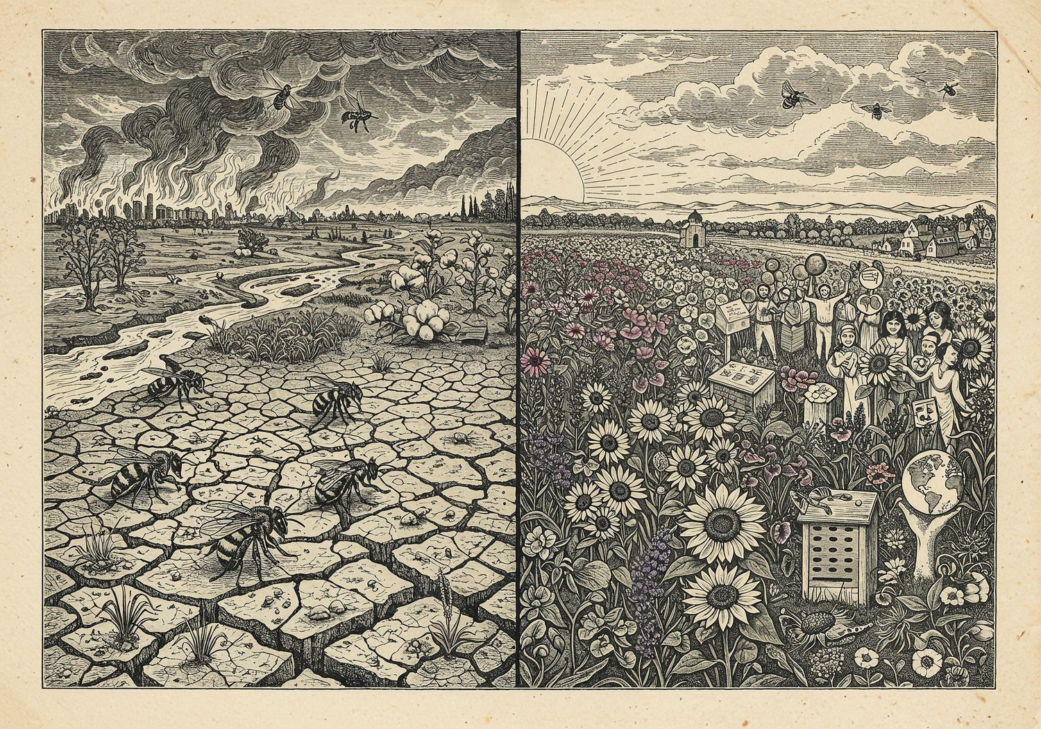 Traditional detailed engraving illustration with modern elements, etched lines, high contrast black and white, meticulous cross-hatching to create depth, printed on aged parchment paper of: A diverse landscape split into two halves: on the left, struggling bees and pollinators amid cracked drought-stricken earth, raging wildfires, flooding rivers, and pesticide spray clouds killing insects near wilted crops like rice fields, cotton plants, and fruit orchards in regions evoking Europe, Asia, and the Americas; on the right, thriving bee colonies in vibrant flower meadows, protected habitats with bee hotels, people planting native flowers like lavender and sunflowers, and global symbols such as diverse hands holding earth icons representing initiatives like farm-to-fork strategies and pollinator networks, with a hopeful sunrise bridging the divide. Illustration: copperplate etching texture, ink lines, dramatic shading, artistic style, deep focus, museum quality print with humorous twist.