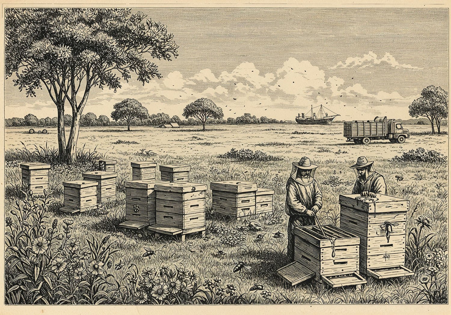 Traditional detailed engraving illustration with modern elements, etched lines, high contrast black and white, meticulous cross-hatching to create depth, printed on aged parchment paper of: A vast Argentine Pampa landscape with endless flat grasslands under a clear blue sky, blooming eucalyptus and acacia trees scattered across the plains, bees swarming around vibrant flowers collecting nectar, several wooden beehives clustered in the foreground with honey dripping from frames, a beekeeper in traditional hat tending to the hives, and in the distant background a truck loaded with hives heading toward a bustling port where cargo ships are loaded with honey barrels for export. Illustration: copperplate etching texture, ink lines, dramatic shading, artistic style, deep focus, museum quality print with humorous twist.