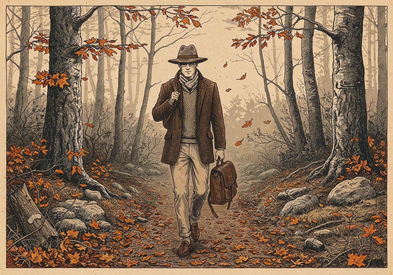 Traditional detailed engraving illustration with modern elements, etched lines, high contrast black and white, meticulous cross-hatching to create depth, printed on aged parchment paper of: Traditional detailed engraving illustration with modern elements, etched lines, high contrast black and white, meticulous cross-hatching to create depth, printed on aged parchment paper of: A man walking elegantly on a forest path during autumn, wearing a brown tweed jacket over a cream sweater, khaki chinos, brown leather loafers, a tweed check scarf, and a fedora hat, carrying a leather backpack, surrounded by trees with rust-colored leaves falling gently to the ground, with mossy undergrowth and a misty atmosphere. Illustration: copperplate etching texture, ink lines, dramatic shading, artistic style, deep focus, museum quality print with humorous twist. Illustration: copperplate etching texture, ink lines, dramatic shading, artistic style, deep focus, museum quality print with humorous twist.
