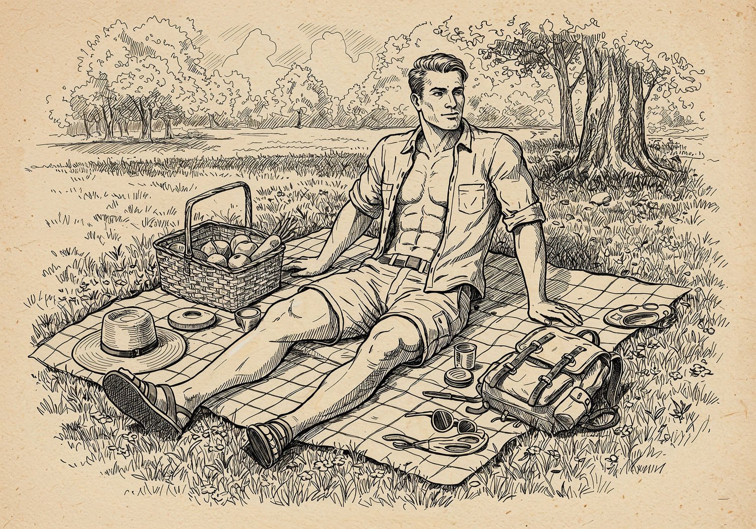 Traditional detailed engraving illustration with modern elements, etched lines, high contrast black and white, meticulous cross-hatching to create depth, printed on aged parchment paper of: Traditional detailed engraving illustration with modern elements, etched lines, high contrast black and white, meticulous cross-hatching to create depth, printed on aged parchment paper of: A muscular athletic man with broad shoulders and toned arms wearing a fitted beige linen shirt with rolled-up sleeves, slim khaki shorts reaching the knees, and brown leather sandals, relaxing on a picnic blanket in a sunny park meadow, surrounded by a wicker basket of food, a frisbee nearby, a Panama hat on the grass, aviator sunglasses on his face, and a canvas backpack beside him, with trees and blue sky in the background. Illustration: copperplate etching texture, ink lines, dramatic shading, artistic style, deep focus, museum quality print with humorous twist. Illustration: copperplate etching texture, ink lines, dramatic shading, artistic style, deep focus, museum quality print with humorous twist.