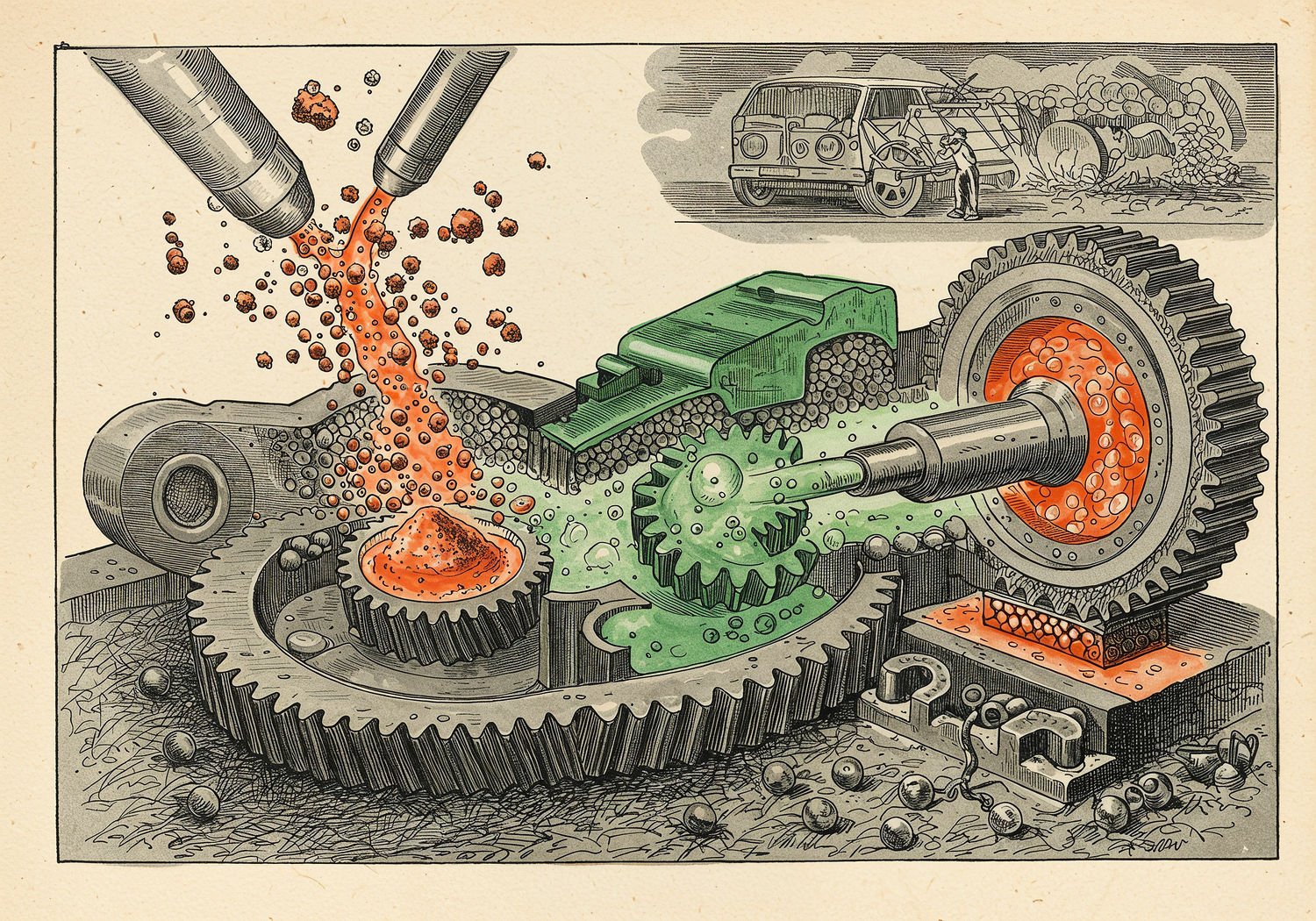 Traditional detailed engraving illustration with modern elements, etched lines, high contrast black and white, meticulous cross-hatching to create depth, printed on aged parchment paper of: Traditional detailed engraving illustration with modern elements, etched lines, high contrast black and white, meticulous cross-hatching to create depth, printed on aged parchment paper of: A detailed cross-section illustration of the powder metallurgy process for creating a car engine gear: on the left, fine metal powder particles (iron with copper additives) being atomized from molten metal; in the center, the powder compressed in a die under high pressure to form a green compact gear shape; on the right, the compact in a sintering furnace where atoms diffuse across particle boundaries to form a solid, dense metal gear with visible microstructural bonds; subtle automotive elements like engine pistons and a fuel-efficient car in the background. Illustration: copperplate etching texture, ink lines, dramatic shading, artistic style, deep focus, museum quality print with humorous twist. Illustration: copperplate etching texture, ink lines, dramatic shading, artistic style, deep focus, museum quality print with humorous twist.