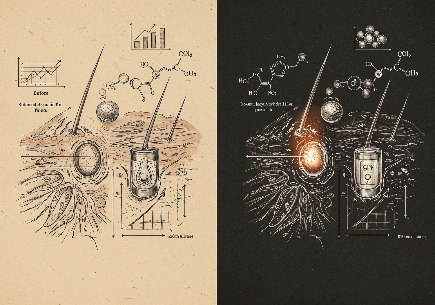 Traditional detailed engraving illustration with modern elements, etched lines, high contrast black and white, meticulous cross-hatching to create depth, printed on aged parchment paper of: Traditional detailed engraving illustration with modern elements, etched lines, high contrast black and white, meticulous cross-hatching to create depth, printed on aged parchment paper of: A split composition illustrating anti-aging skincare: on the left, a close-up of mature skin with visible wrinkles, dryness, and uneven texture representing before treatment; on the right, the same skin transformed to smooth, radiant, and youthful with increased collagen fibers visible beneath; in the center, molecular structures of retinoids (vitamin A derivatives) merging with bakuchiol extracted from Psoralea corylifolia seeds, surrounded by icons of scientific graphs showing wrinkle reduction percentages, a nighttime skincare routine with serums and creams, and protective SPF shield against UV rays. Illustration: copperplate etching texture, ink lines, dramatic shading, artistic style, deep focus, museum quality print with humorous twist. Illustration: copperplate etching texture, ink lines, dramatic shading, artistic style, deep focus, museum quality print with humorous twist.