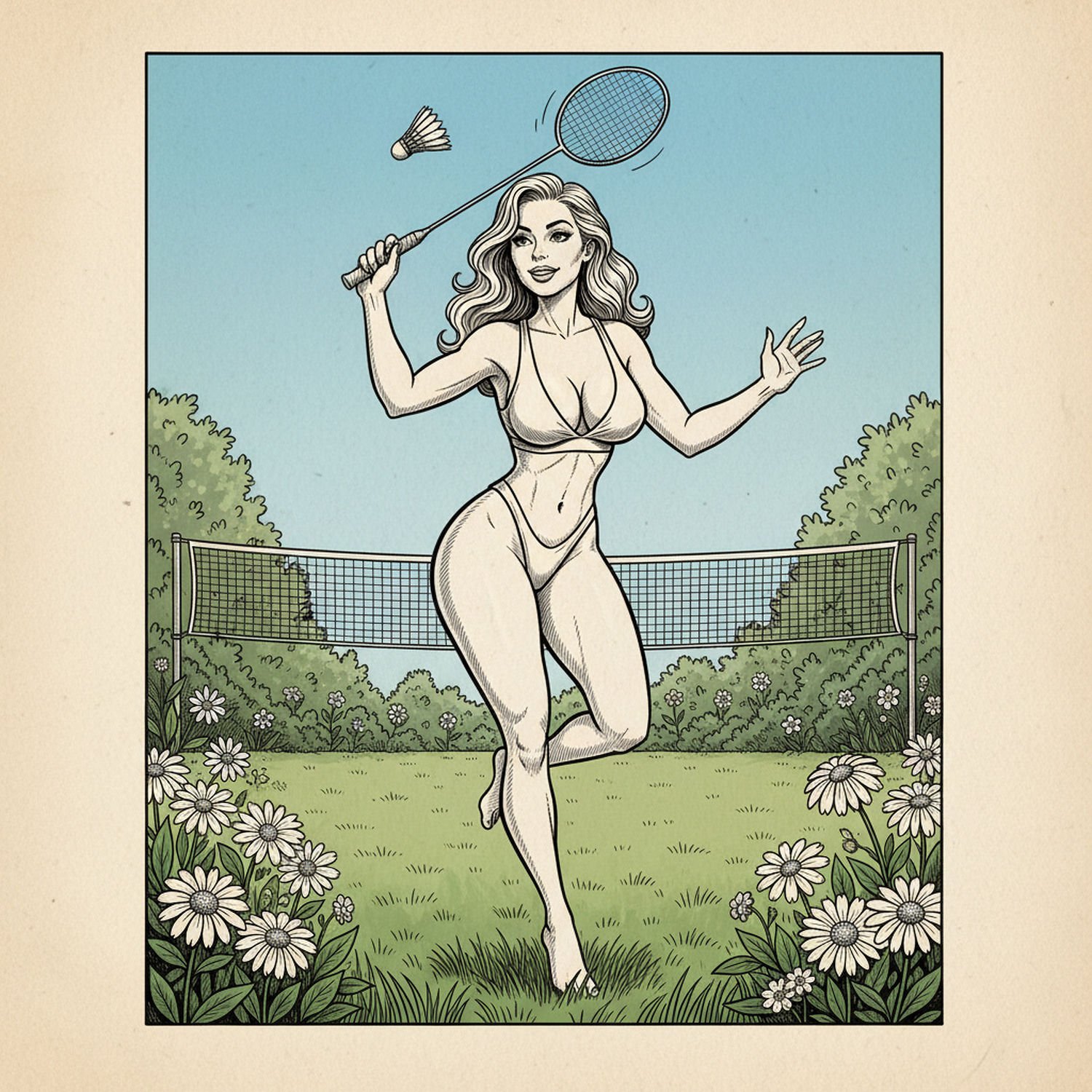 Traditional detailed engraving illustration with modern elements, etched lines, high contrast black and white, meticulous cross-hatching to create depth, printed on aged parchment paper, of: A confident woman in athletic wear dynamically leaping in a lush garden to smash a badminton shuttlecock with her racket, her legs extended and muscles engaged, surrounded by green grass, blooming flowers, and a net stretched across the yard under a clear blue sky. ;;Female person: exaggerated, almost caricatured hourglass figure with ultra-emphasized, voluptuous curves and striking feminine proportions.