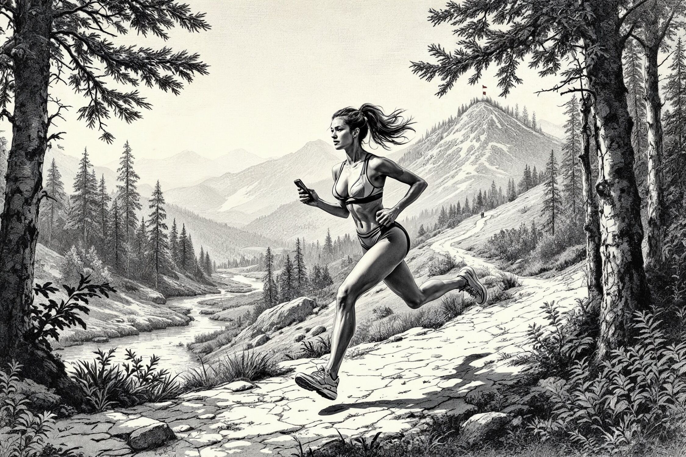 Traditional detailed engraving illustration with modern elements, etched lines, high contrast black and white, meticulous cross-hatching to create depth, printed on aged parchment paper, of: A confident young woman running dynamically through a lush forest trail, holding a detailed topographic map in one hand and a compass in the other, spotting a red flag control point ahead on a hill, with sweat on her brow and an athletic, toned physique in sporty running gear, surrounded by trees, streams, and varied terrain under a clear sky. ;;Female person: exaggerated, almost caricatured hourglass figure with ultra-emphasized, voluptuous curves and striking feminine proportions.