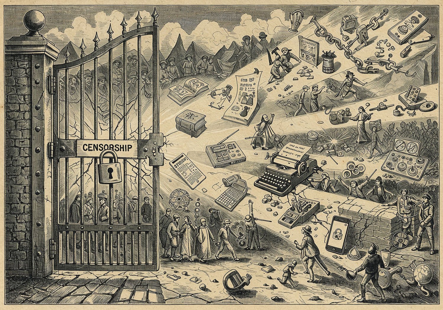 Traditional detailed engraving illustration with modern elements, etched lines, high contrast black and white, meticulous cross-hatching to create depth, printed on aged parchment paper of: A symbolic illustration depicting censorship as a catalyst for innovation: in the foreground, a massive iron gate with a padlock labeled „Censorship” blocks a path, but cracks in the gate release glowing streams of light transforming into historical and modern inventions—ancient coded scrolls, underground printing presses with hidden books, typewriters producing samizdat pages, secret radios broadcasting Morse code, a digital firewall pierced by onion-routed networks like Tor, encrypted smartphones with Signal apps, and blockchain chains linking decentralized nodes—culminating in a burst of creative energy eroding the gate’s structure, with diverse figures from different eras reaching toward freedom and new technologies in the background. Illustration: copperplate etching texture, ink lines, dramatic shading, artistic style, deep focus, museum quality print with humorous twist.