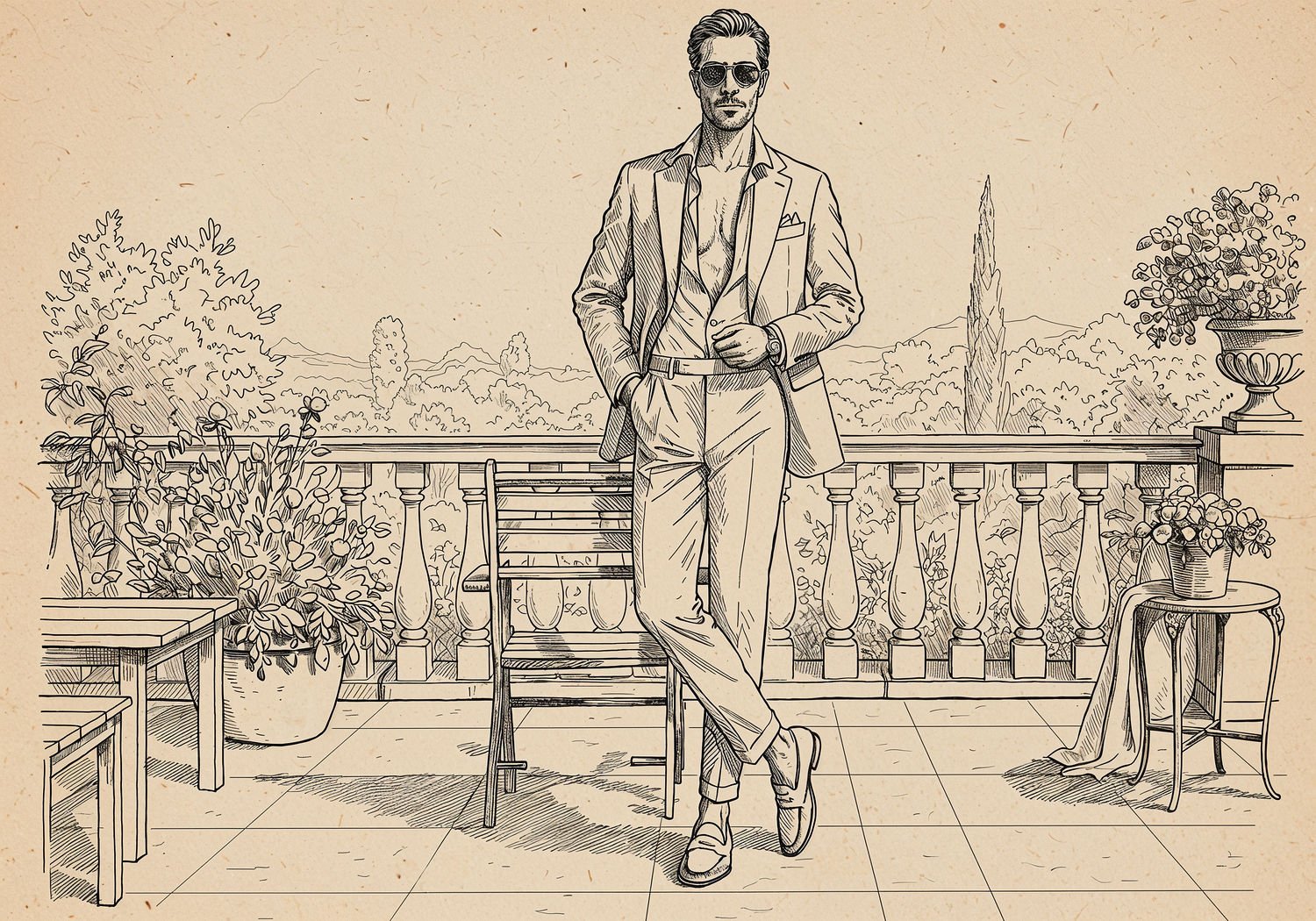 Traditional detailed engraving illustration with modern elements, etched lines, high contrast black and white, meticulous cross-hatching to create depth, printed on aged parchment paper of: A confident man in his thirties wearing a light beige single-breasted two-button summer suit made of breathable wool, standing outdoors on a sunny terrace with a garden in the background, the jacket slightly open to reveal a white oxford shirt without a tie, paired with slim tapered trousers, beige loafers, and aviator sunglasses, one hand in his pocket, exuding relaxed elegance and poise. Illustration: copperplate etching texture, ink lines, dramatic shading, artistic style, deep focus, museum quality print with humorous twist.
