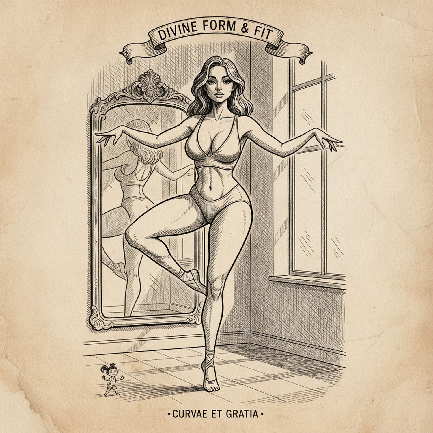 Traditional detailed engraving illustration with modern elements, etched lines, high contrast black and white, meticulous cross-hatching to create depth, printed on aged parchment paper, of: A confident woman in fitted leggings and a top performing a graceful dance-fitness movement, with one leg extended in a ballet-inspired lift, arms flowing elegantly like waves, hips swaying rhythmically, standing in a sunlit home studio with a mirror reflecting her poised posture, exuding sensuality and poise. ;;Female person: exaggerated, hourglass figure with ultra-emphasized, voluptuous curves and striking feminine proportions of godess.