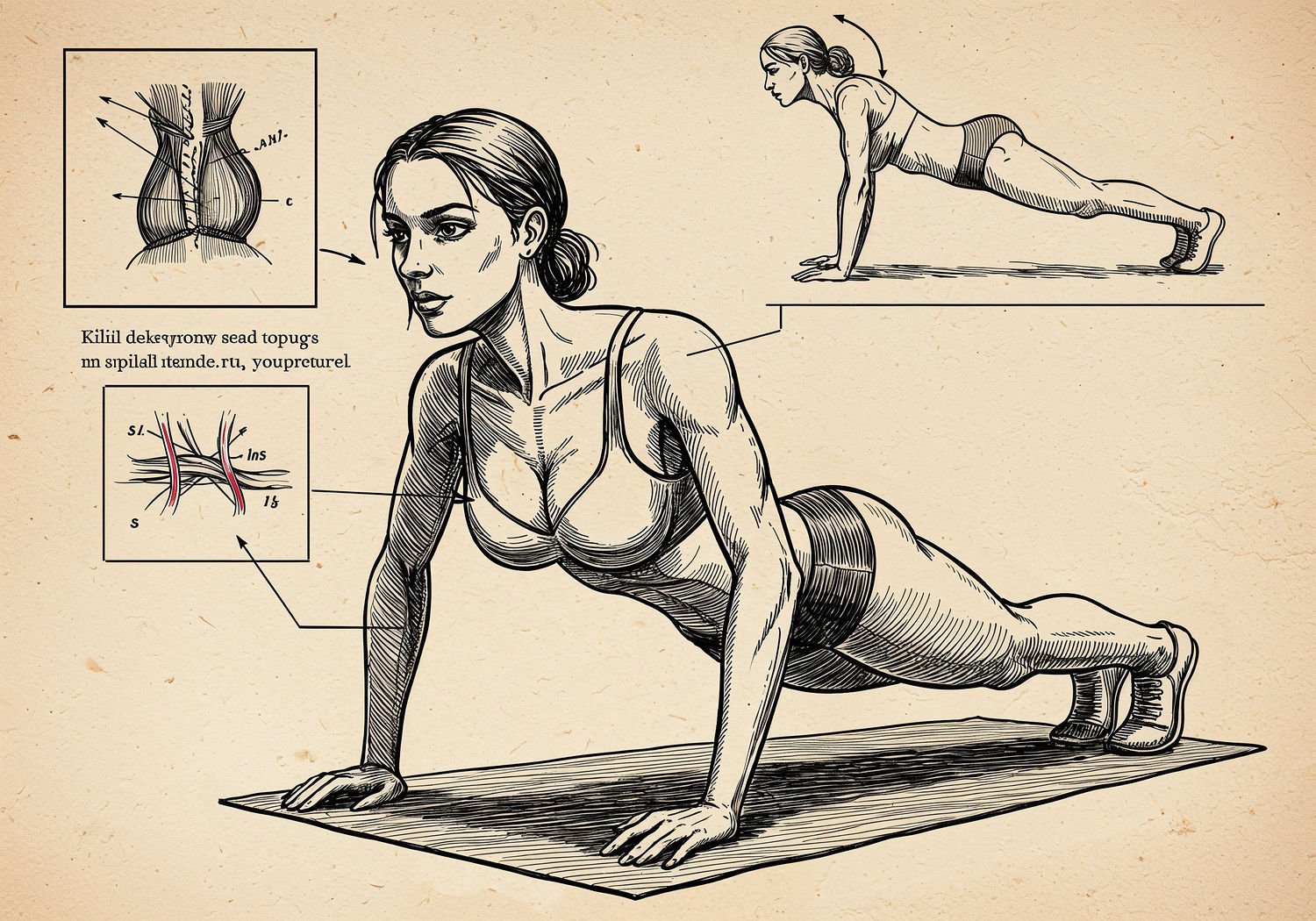 Traditional detailed engraving illustration with modern elements, etched lines, high contrast black and white, meticulous cross-hatching to create depth, printed on aged parchment paper, of: A confident woman in a supportive sports bra performing push-ups on a gym mat, with her chest muscles engaged and posture straight, while inset diagrams illustrate minimal breast movement during exercise and strong pectoral muscle support beneath the bust. ;;Female person: exaggerated, hourglass figure with ultra-emphasized, voluptuous curves and striking feminine proportions of godess.