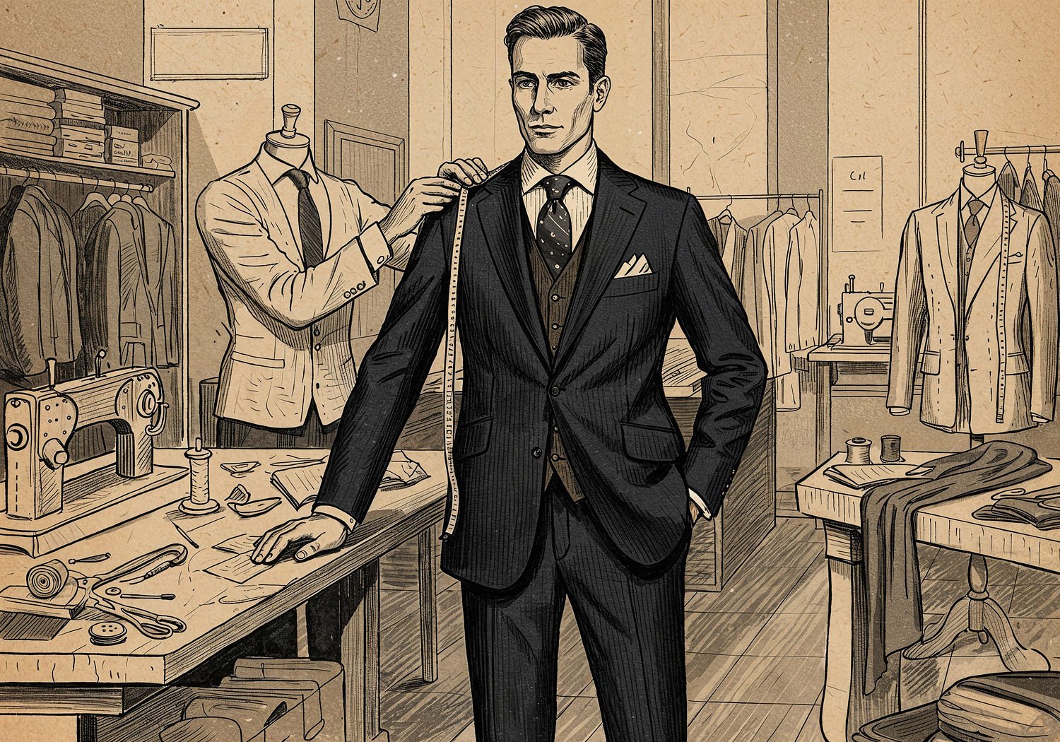 Traditional detailed engraving illustration with modern elements, etched lines, high contrast black and white, meticulous cross-hatching to create depth, printed on aged parchment paper of: A confident, elegant man standing in a professional tailoring workshop, wearing a classic single-breasted two-button navy wool suit with notch lapels, matching trousers, and an optional vest, as a skilled tailor measures his shoulders with a tape measure, surrounded by fabric swatches, sewing tools, and a half-finished suit on a mannequin, highlighting bespoke craftsmanship and timeless style. Illustration: copperplate etching texture, ink lines, dramatic shading, artistic style, deep focus, museum quality print with humorous twist.