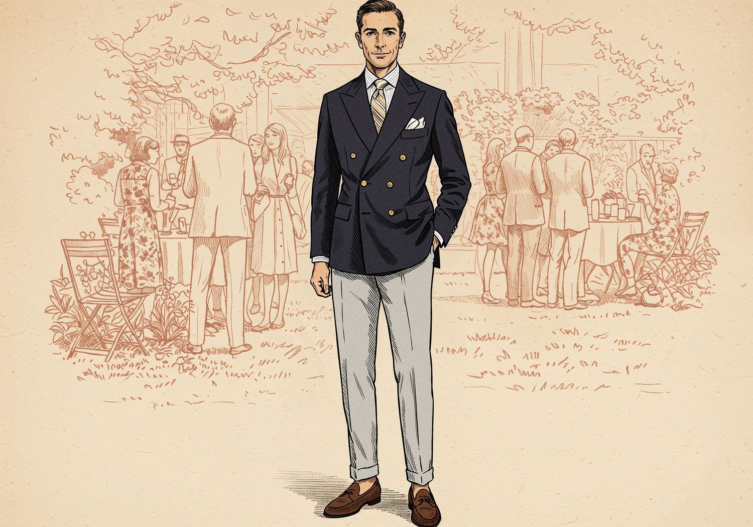 Traditional detailed engraving illustration with modern elements, etched lines, high contrast black and white, meticulous cross-hatching to create depth, printed on aged parchment paper of: A confident, stylish man standing in a tailored navy double-breasted blazer with six gold buttons, peak lapels, and patch pockets, paired with light grey trousers slightly tapered at the ankles, white oxford shirt, subtle striped tie, brown loafers, and a pocket square; he poses elegantly in a semi-formal outdoor garden party setting with blurred background of people mingling, emphasizing comfort and sophistication. Illustration: copperplate etching texture, ink lines, dramatic shading, artistic style, deep focus, museum quality print with humorous twist.