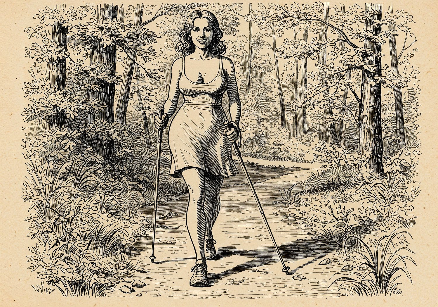 Traditional detailed engraving illustration with modern elements, etched lines, high contrast black and white, meticulous cross-hatching to create depth, printed on aged parchment paper, of: A confident woman in her 30s with a harmonious, toned figure walks energetically on a scenic forest path during summer, using Nordic walking poles to push off the ground, engaging her arms, core, legs, and back muscles fully, dressed in a light flowing dress and sneakers, smiling with a sense of lightness and self-assurance, surrounded by green trees and sunlight filtering through leaves. ;;Female person: exaggerated, almost caricatured hourglass figure with ultra-emphasized, voluptuous curves and striking feminine proportions.