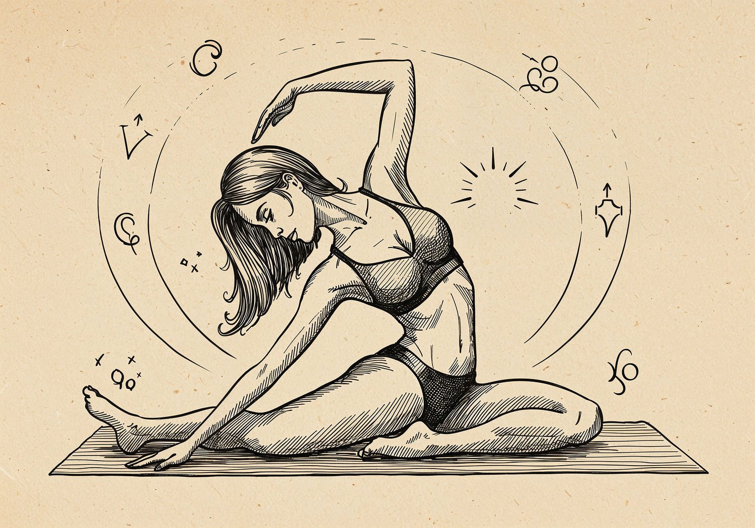 Traditional detailed engraving illustration with modern elements, etched lines, high contrast black and white, meticulous cross-hatching to create depth, printed on aged parchment paper, of: A confident young woman in comfortable activewear performing a gentle hip-opening stretch in the butterfly pose on a yoga mat, sitting with soles of her feet together and knees spread wide, leaning forward slightly with a relaxed and serene expression, surrounded by subtle icons of flowing movements like soft waves and light stretching lines to evoke fluidity and ease in daily life. ;;Female person: exaggerated, hourglass figure with ultra-emphasized, voluptuous curves and striking feminine proportions of godess.