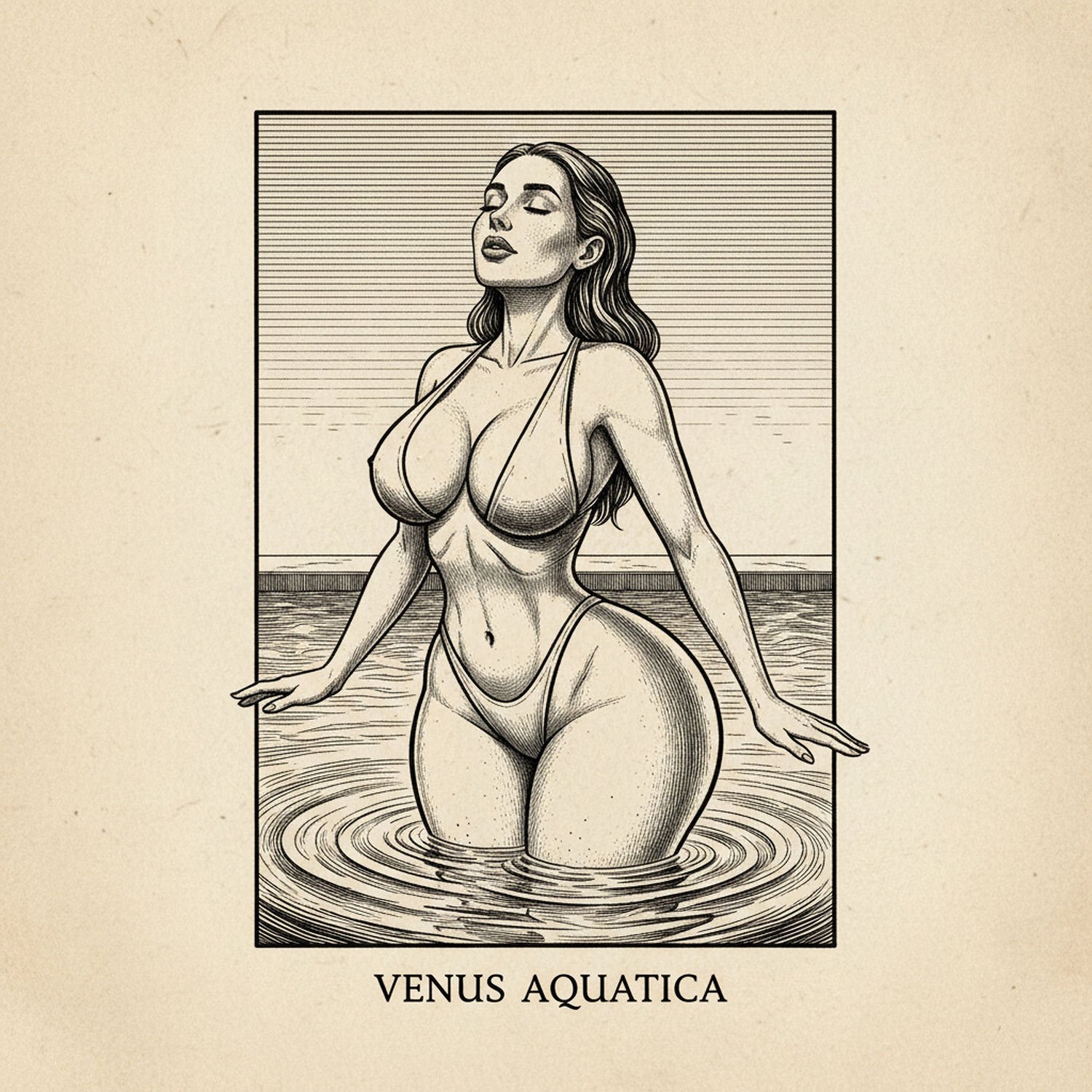 Traditional detailed engraving illustration with modern elements, etched lines, high contrast black and white, meticulous cross-hatching to create depth, printed on aged parchment paper, of: A confident woman swimming gracefully in an outdoor pool under a clear blue sky, her body partially submerged in rippling water that gently massages her smooth, toned skin on thighs and abdomen, showing reduced cellulite and firm contours; she emerges from a breath-held dive with a serene, empowered expression, fresh air and sunlight highlighting her relaxed posture, evoking sensory harmony and intimate vitality. ;;Female person: exaggerated, almost caricatured hourglass figure with ultra-emphasized, voluptuous curves and striking feminine proportions.