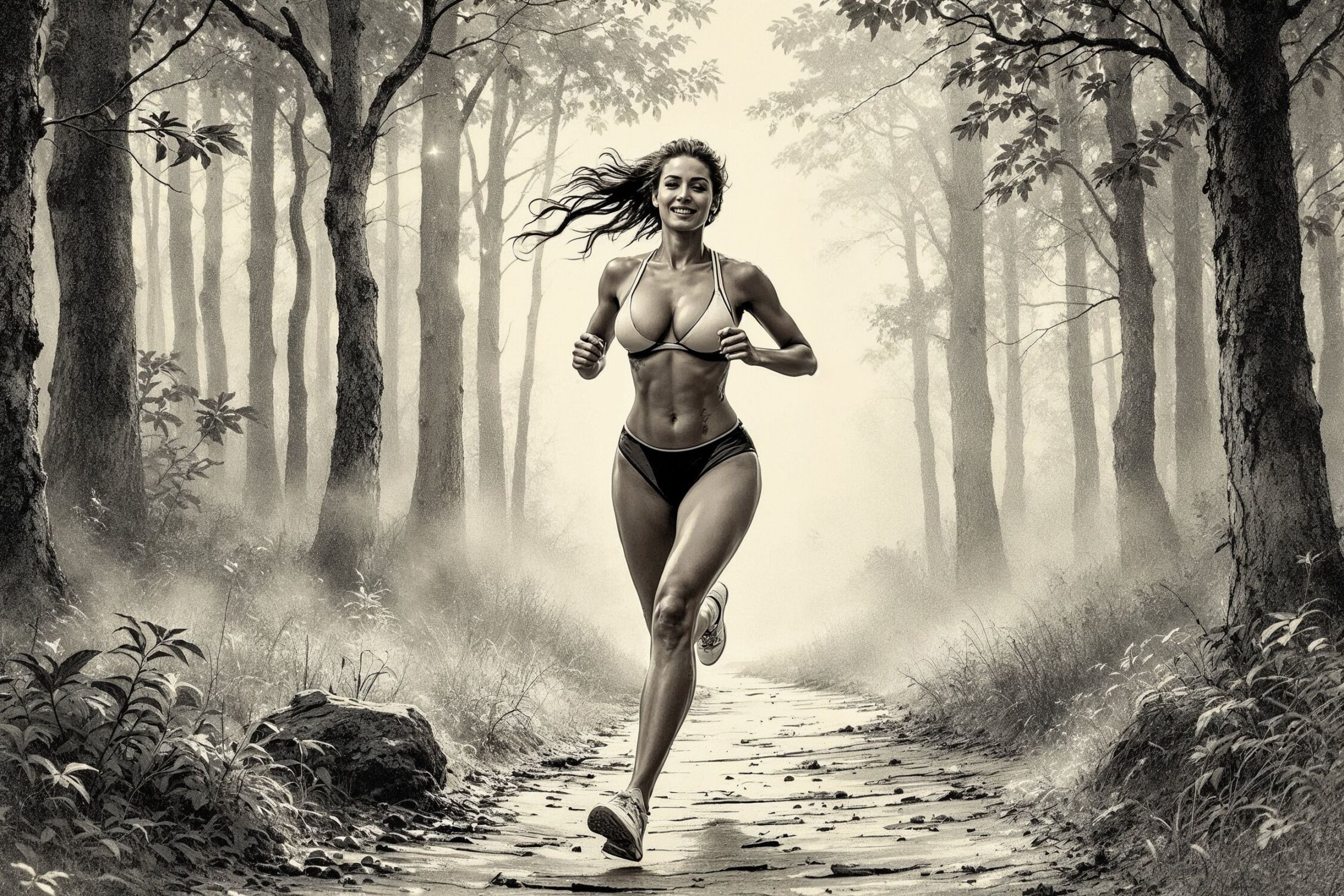 Traditional detailed engraving illustration with modern elements, etched lines, high contrast black and white, meticulous cross-hatching to create depth, printed on aged parchment paper, of: A woman jogging energetically on a forest path at dawn, surrounded by tall trees with morning mist rising from the ground, sunlight filtering through leaves to illuminate her glowing skin and bright eyes, her expression joyful and vital, breathing in fresh air with endorphins symbolized by subtle sparkles around her body, evoking health, beauty, and natural radiance. ;;Female person: exaggerated, almost caricatured hourglass figure with ultra-emphasized, voluptuous curves and striking feminine proportions.