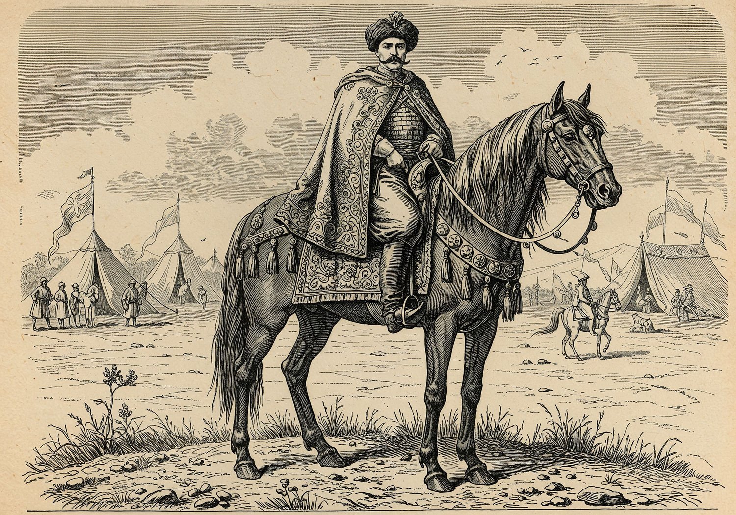 Traditional detailed engraving illustration with modern elements, etched lines, high contrast black and white, meticulous cross-hatching to create depth, printed on aged parchment paper of: A Polish nobleman from the 17th century, dressed in a flowing kontusz cloak with golden embroidery, a fitted żupan vest, loose szarawary pants tucked into boots, and a curved karabela saber at his side with a bird-head hilt, riding a sturdy Arabian horse adorned with a high-backed Persian saddle, embroidered czaprak, and dangling stirrups featuring lion motifs, standing proudly on a vast steppe landscape under a clear sky, with distant tents and a mix of Polish and Eastern banners in the background. Illustration: copperplate etching texture, ink lines, dramatic shading, artistic style, deep focus, museum quality print with humorous twist.