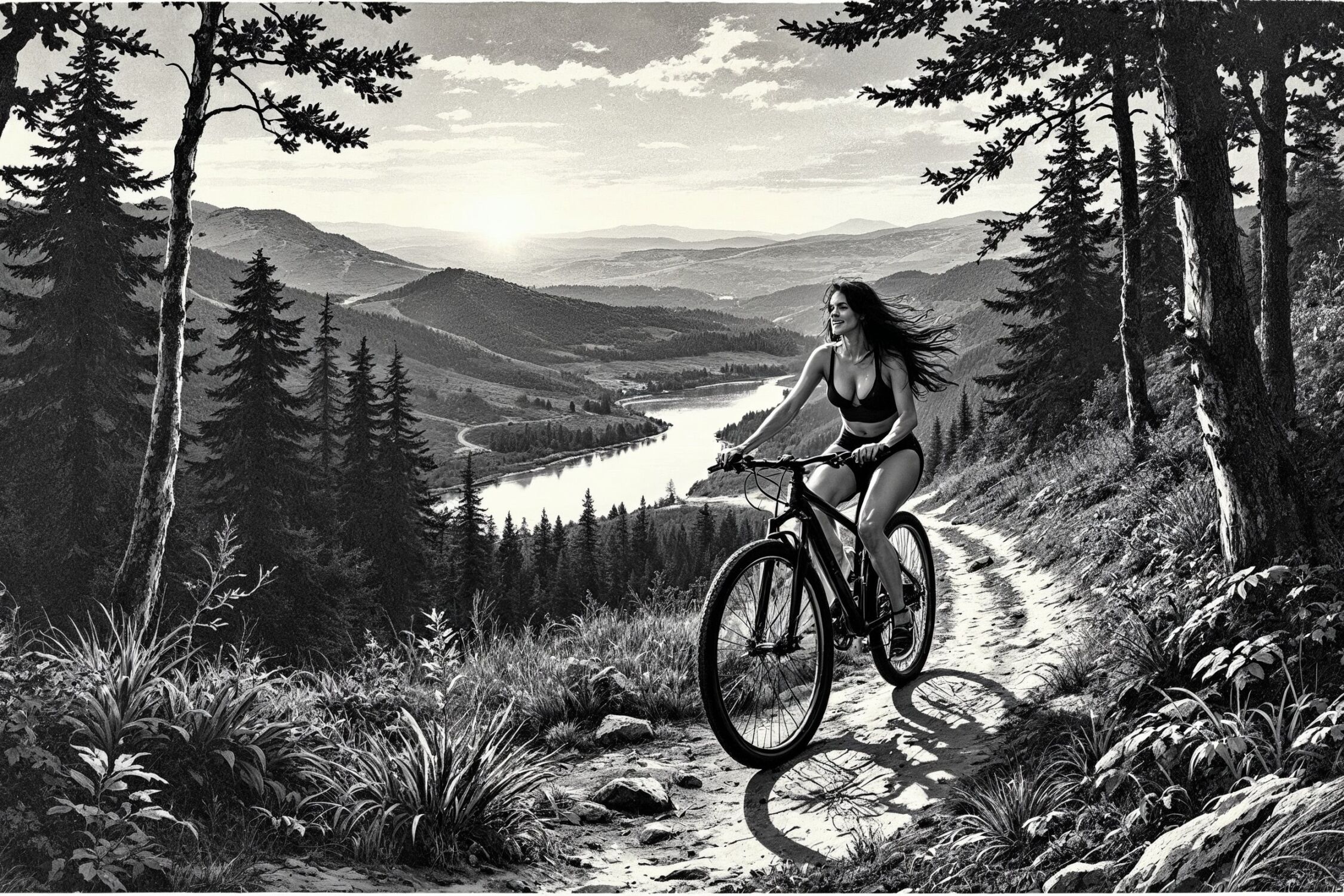 Traditional detailed engraving illustration with modern elements, etched lines, high contrast black and white, meticulous cross-hatching to create depth, printed on aged parchment paper, of: A couple on mountain bikes riding together along a scenic forested trail at sunset, with rolling hills and a river in the background, sharing a joyful glance while pedaling uphill, sweat on their faces, evoking adventure and intimacy. ;;Female person: exaggerated, almost caricatured hourglass figure with ultra-emphasized, voluptuous curves and striking feminine proportions.